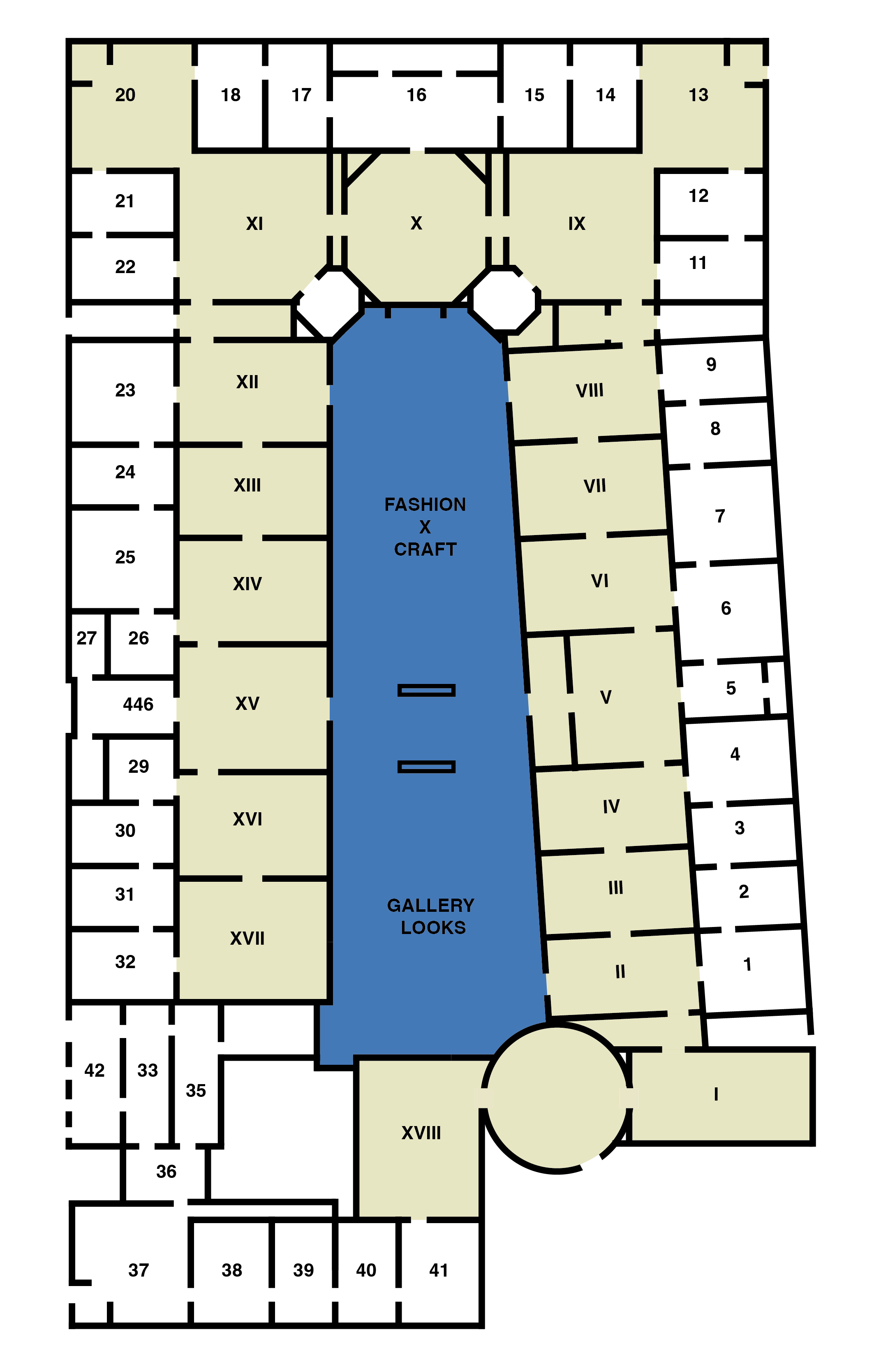 The exhibition map helps you navigate through the exhibition and easily locate each participating designer throughout the Gemäldegalerie, guiding you from room to room across the fashion and accessory presentations.